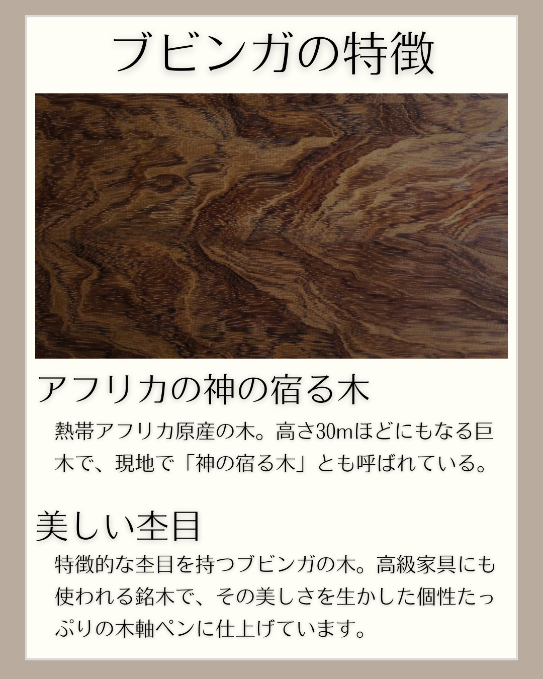 熱帯アフリカ原産の木で、高さ30mほどにもなる巨木。現地では「神の宿る木」とも呼ばれているアフリカの銘木です。特徴的な美しい杢目を持ち、高級家具などにも使われています。