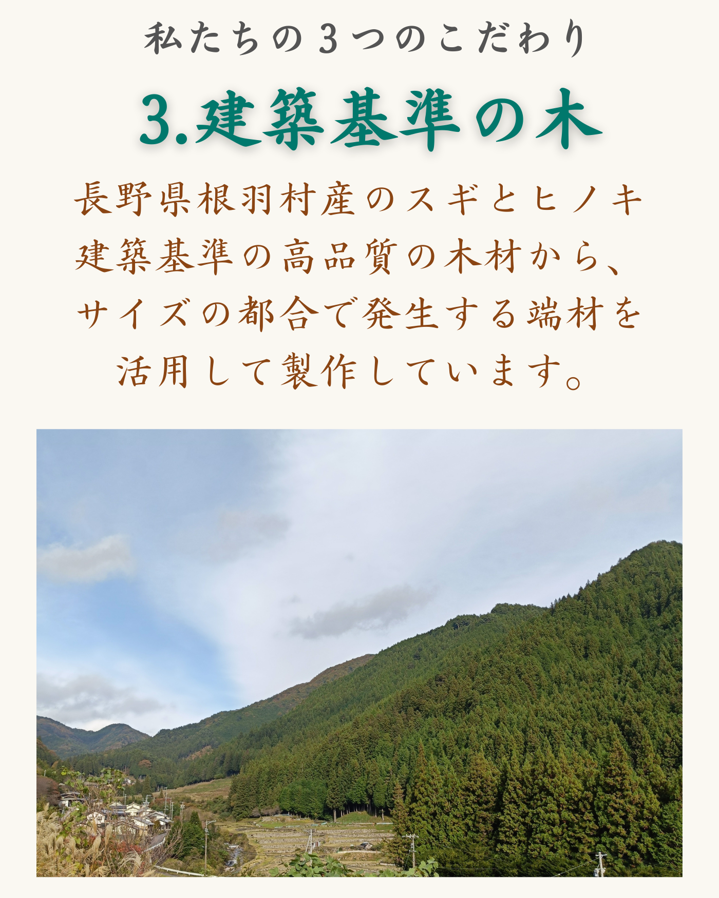 商品に使用するのは、長野県根羽村で育ったスギやヒノキです。根羽村は長野県の南、愛知県との県境に位置しています。村民のほとんどが山を持っているという、森とともに生きる村です。豊かな水と気候があり、木が育つすばらしい環境が整っています。