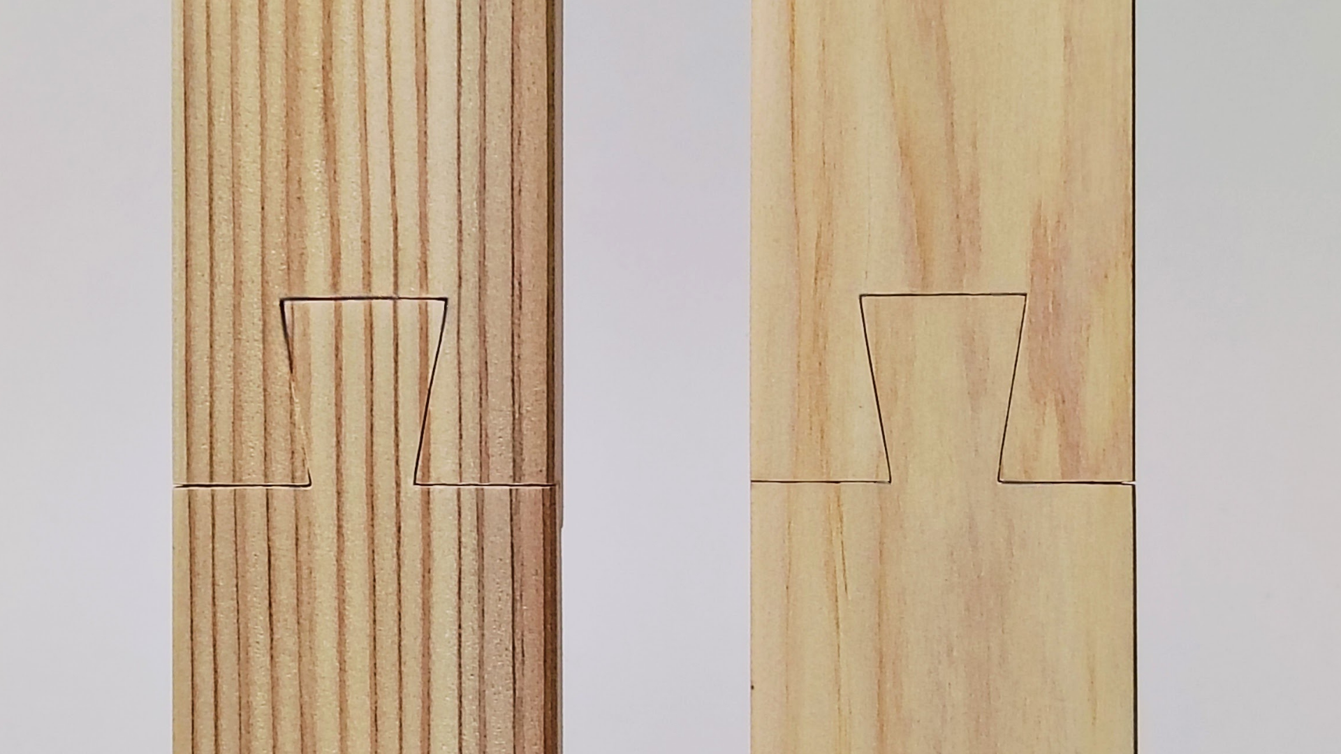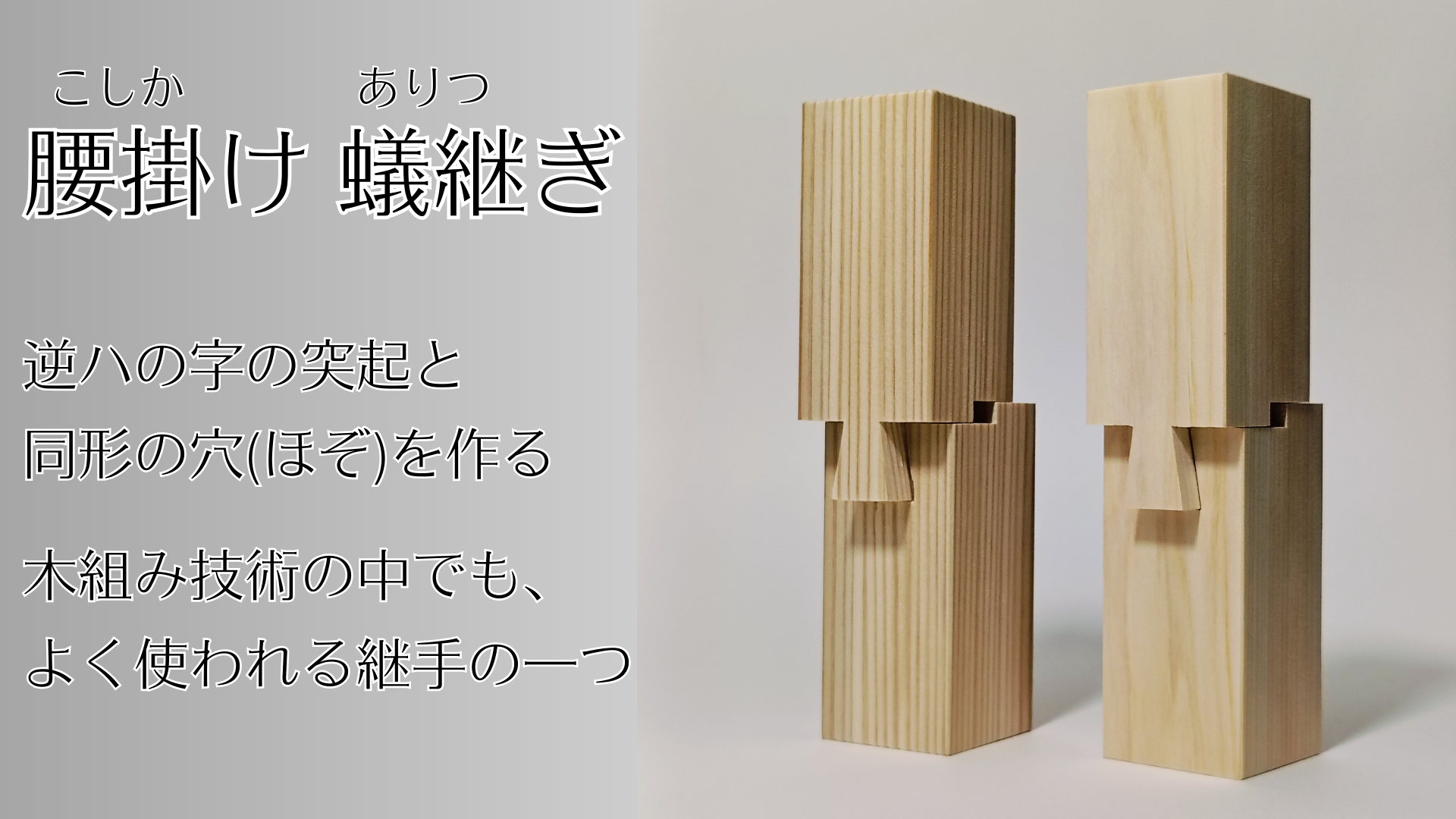 商品に使用しているのは「腰掛け蟻継ぎ」と呼ばれる継手です。一方は逆ハの字の突起があり、もう一方は「ほぞ」と呼ばれる同形の穴を作ります。「腰掛け」と呼ばれる段差を作ることで、強度を高めています。引き抜きに強い構造で、木組み技術の中でもよくつかわれる継手です。シンプルな構造ながら宮大工の技術と知恵が詰まった継手です。
